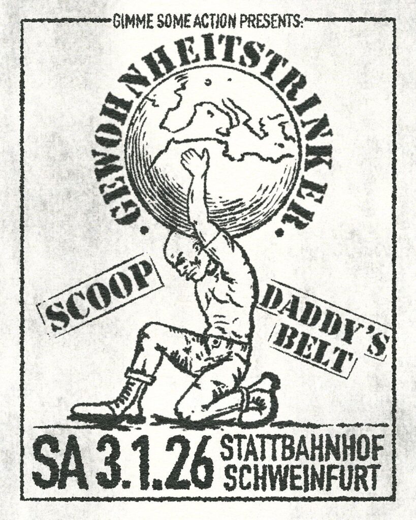 Wir starten am Samstag, den 3. Januar, ins neue Jahr mit der ersten Gimme Some Action Show überhaupt. Mit dabei sein werden Gewohnheitstrinker, Scoop und Daddy’s Belt – Abriss garantiert!